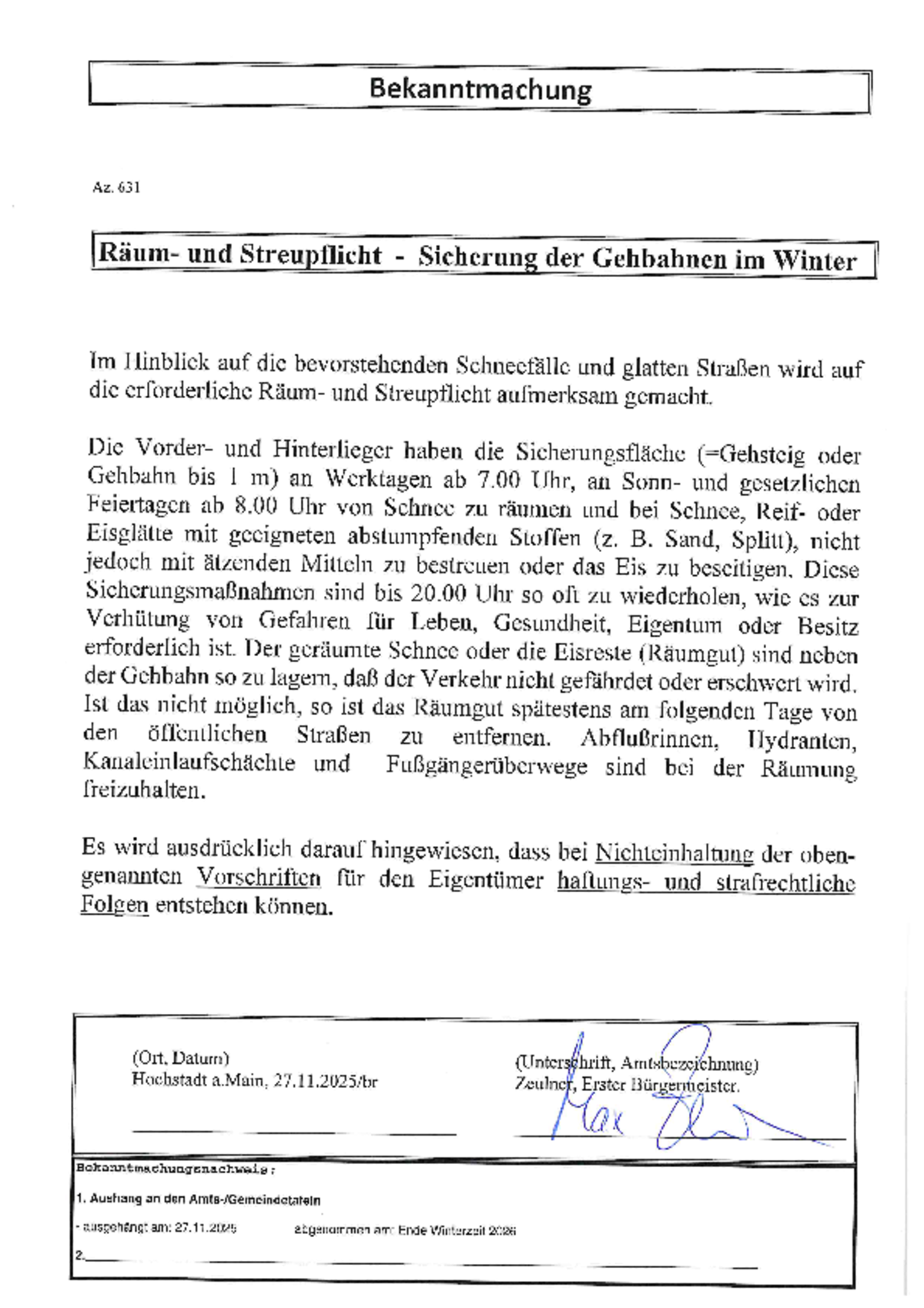 Bekanntmachung Räum- und Streupflicht