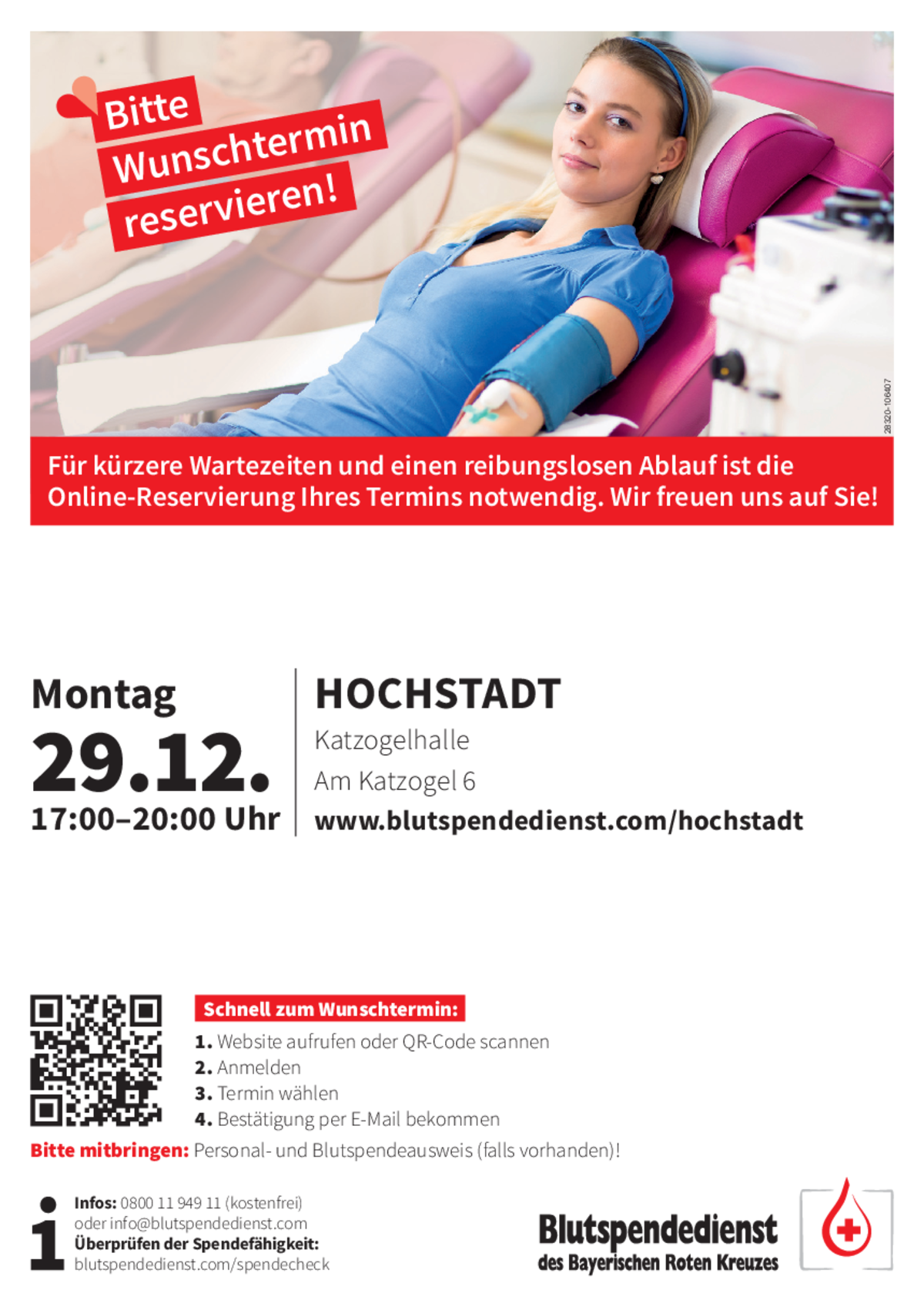 Am Montag, 29.12.2025 von 17:00-20:00 Uhr kann in der Katzogelhalle in Hochstadt a.Main Blut gespendet werden.