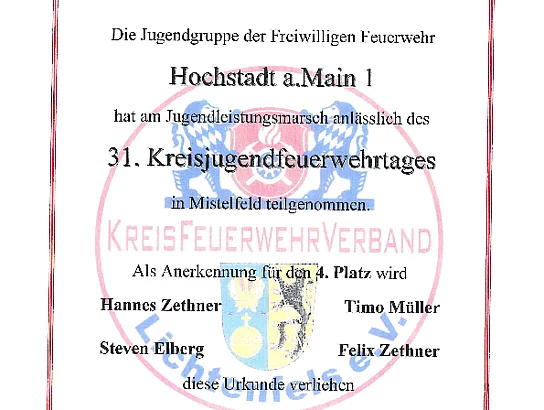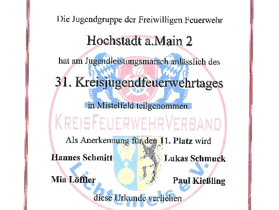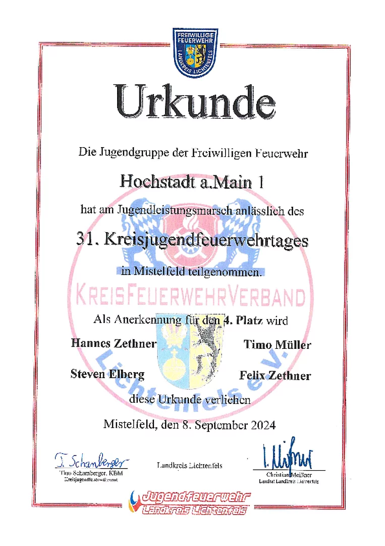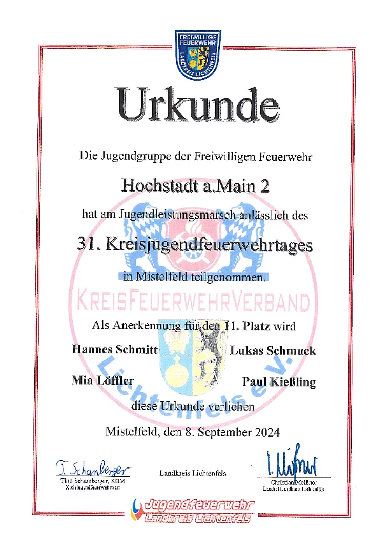 Die zwei Gruppen aus dem Hochstadter Gemeindegebiet erreichten die hervorragenden Plätze 4 und 11. Die viertplatzierten Jugendlichen nehmen somit am Jugendbezirksleistungsmarsch am 28.09.2024 in Wallenfels teil.